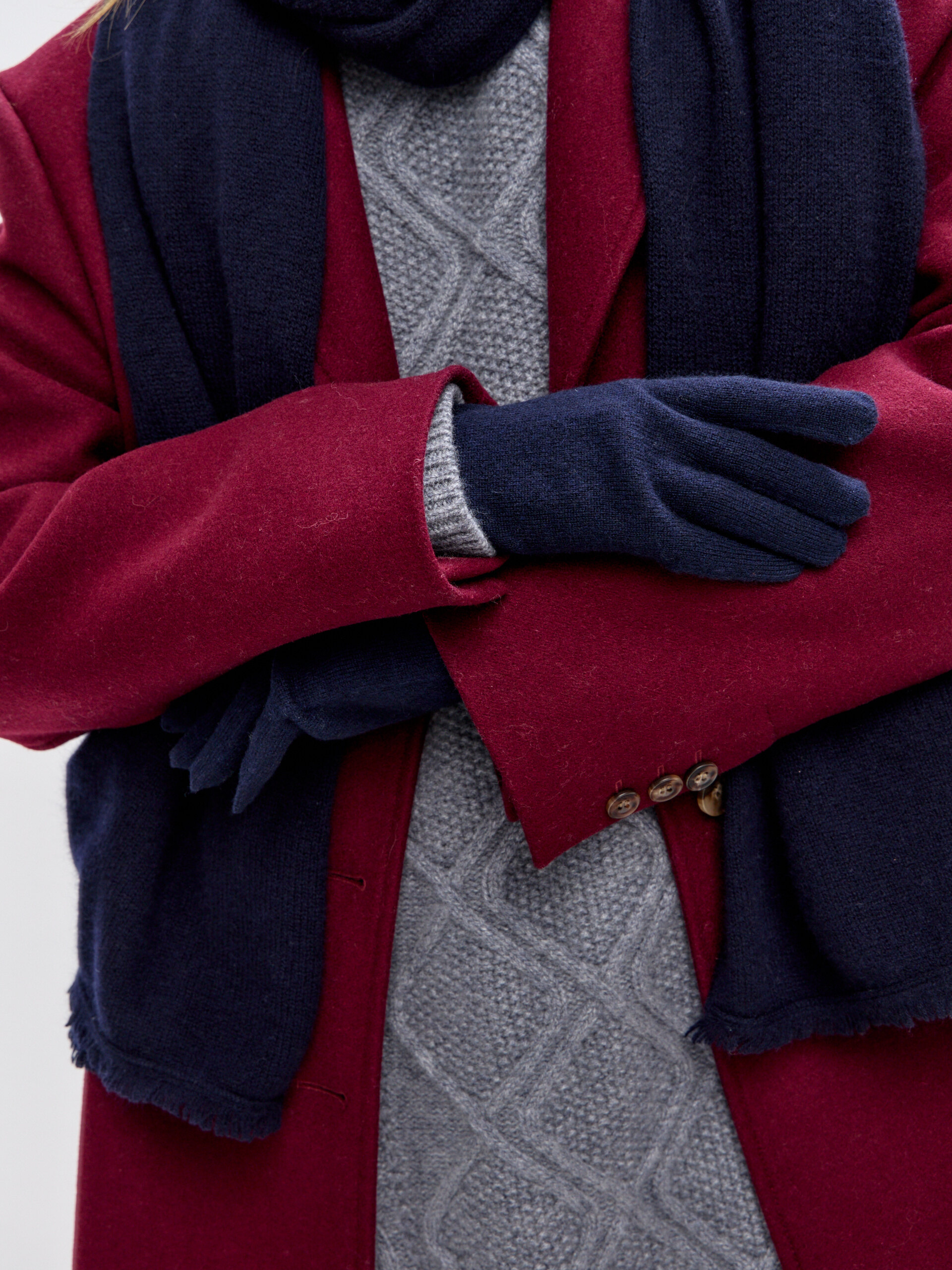 Перчатки из 100% кашемира. Безупречный материал почти не ощущается на коже и особенно хорошо сохраняет тепло. На большом и указательном пальцах есть специальные чувствительные нити для использования экрана телефона, что особенно необходимо зимой.